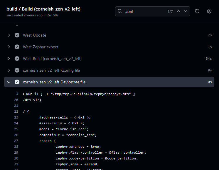 Additionally, the build command (in "West Build (<keyboard>)" step in GitHub Actions) logs what configuration files were found and used in the build: